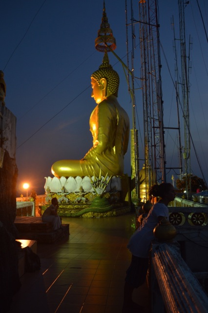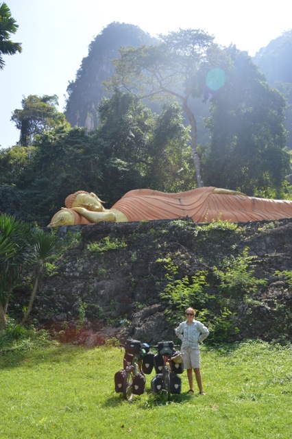 Watching the sunrise over the mountains with cup of tea in hand, I had no idea that this would be the highlight of my final hours in Thailand. Food availability continued to be dismal. After cycling through numerous villages and being waved away from a handful of restaurants, we eventually found a lean-to where a lady agreed to make us breakfast – spicy crab-flavoured papaya salad on cold rice noodles. The remainder of the morning found us marveling at the variety of Buddhist paraphernalia present in temples. The most dubious were the large reclining Buddha with red toenail polish, big green disco ball Buddha in sitting pose, a sparkle horse, and many animal guardians with evil eyes and protruding genitalia.